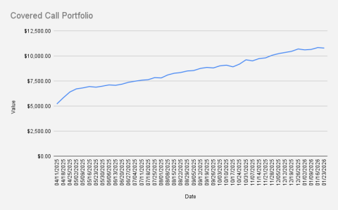 As of January 30, 2026, our covered-call stock portfolio has once again increased by +2.43% and closed at $11,050. For the first time, we’ve cracked the $11K milestone. Awesome.