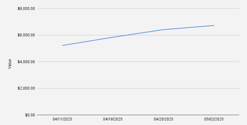 As of May 2, 2025, our covered call stock portfolio was valued at $6,722, reflecting another strong 4.85% week-over-week gain. However, we still remain down -11.61% year-to-date.