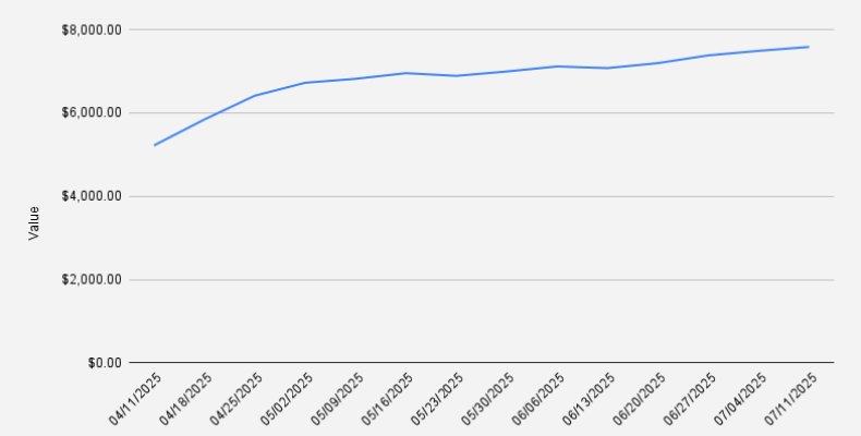 As of July 11, 2025, our covered call stock portfolio stood at $7,582, another +1.26% week-over-week increase (+$94). Year-to-date, we are still down -2.94%.