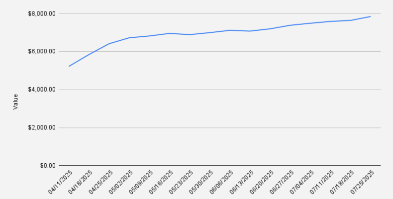 As of July 25, 2025, our covered call stock portfolio stood at $7,841, another +2.69% week-over-week increase (+$205). Year-to-date, we are finally in positive territory with +0.37%. Awesome!