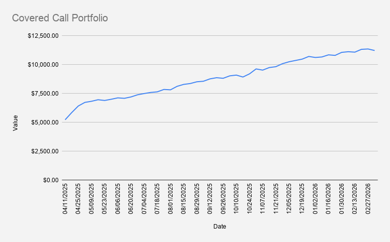 As of March 6, 2026, our covered-call stock portfolio has decreased slightly by -1.16% and closed at $11,211.
