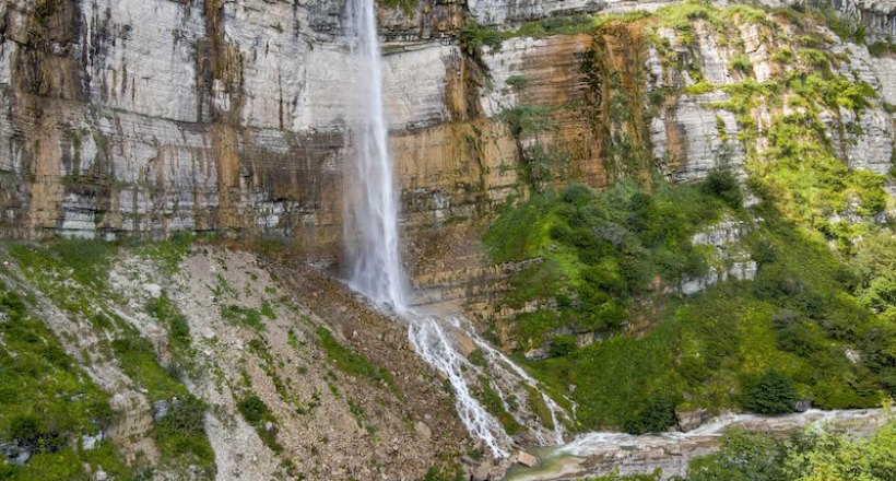 Kinchkha Waterfall has three steps in the chalkstone slopes: the upper step with 25m height drop, the main waterfall with 70 meter height drop and the third one with 20 meters high drop, which has an additional water supply from the small streams.