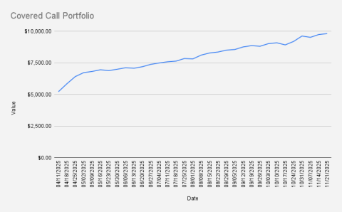 As of November 14, 2025, our covered call stock portfolio has slightly increased to to $9,735, what is a minor increase of +2.32% (+$220 if compared to the previous week. $10,000 feels within reach. With disciplined risk management, we should be able to hit it by year-end — a solid springboard for 2026.