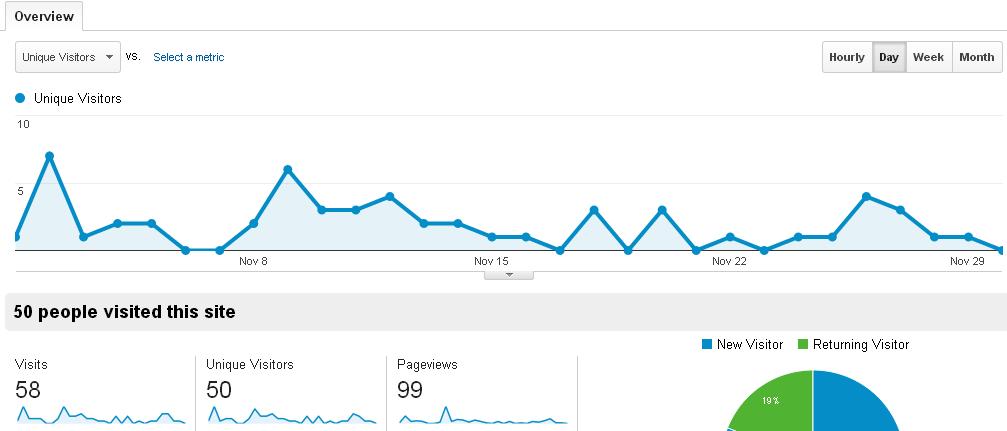 In month of November I have attracted 50 unique visitors to my site, which I think is very bad result. In October I attracted just 39, but that was first month of bloging, and even so, I started not on 1st October, but on 10th of October. Number of 50 unique visitors for site in 30 days is really, really bad result. I'm not even talking about some static site, where content has been outdated for many years - I'm talking about blog, which posts everyday some article. On the other hand, I haven't used much social sharing, just some twitter. Anyway in previous post about blog statistics I forecasted that this month I'm willing to see 150-200 unique users this month. I did just 33% of my expectations.
