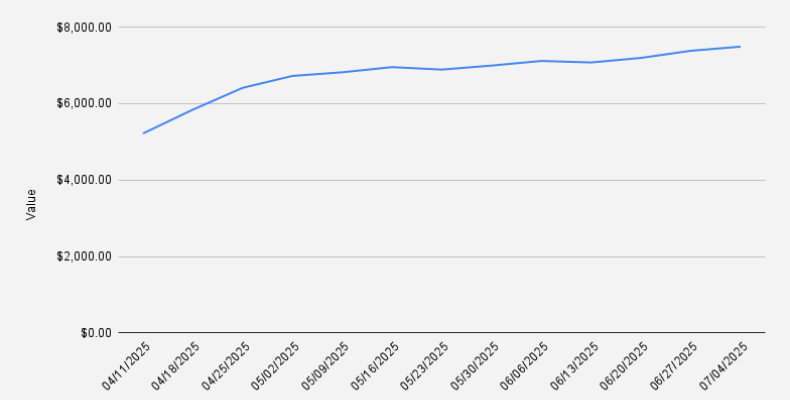 As of July 4, 2025, our covered call stock portfolio stood at $7,488, another +1.46% week-over-week increase (+$107). Year-to-date, we are still down -4.97%.