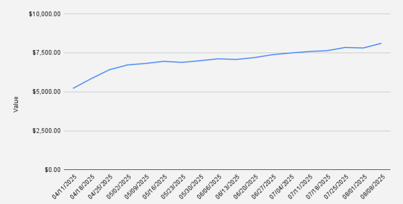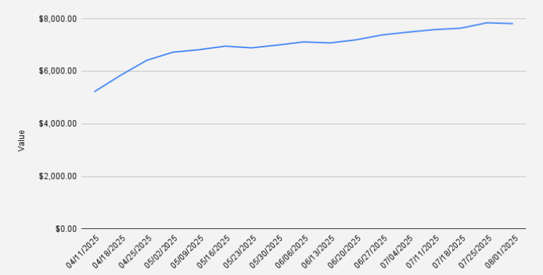 As of August 1, 2025, our covered call stock portfolio stood at $7,810, what is a slight decrease of -0.4% if compared to previous week (-$31). While Year-to-date, we are still in positive territory with +1.69%. Awesome!