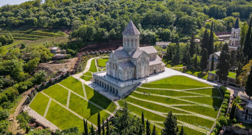 The Bodbe Monastery is nested among tall Cypress trees on a steep hillside overlooking the Alazani Valley, where it commands views of the Greater Caucasus mountains.