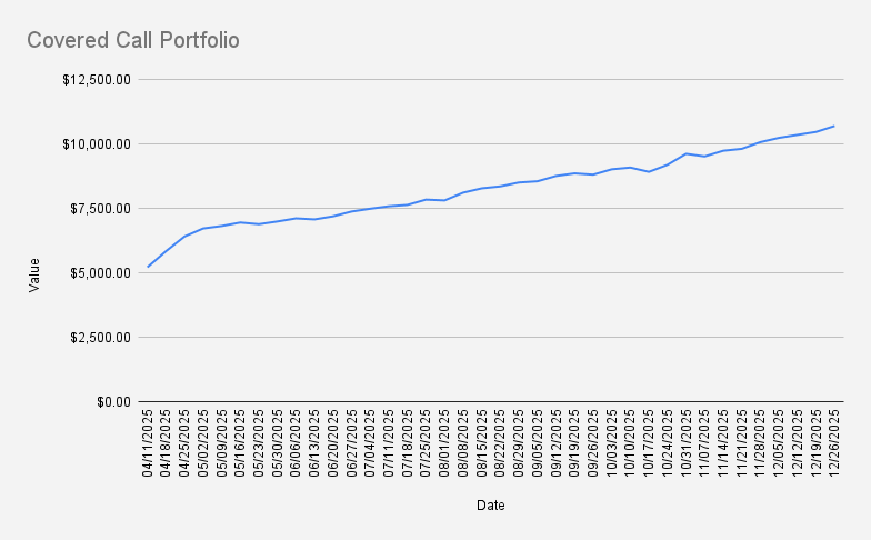 As of December 26, 2025, our covered-call stock portfolio has grown by an additional 2.21% and reached $10,696. As this is the final options expiry Friday of the year, I’m pleased to be closing 2025 with the portfolio above $10k.