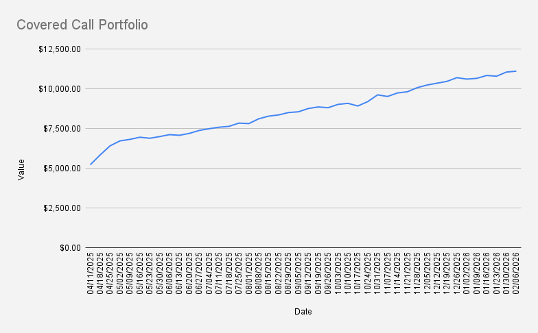 As of February 6, 2026, our covered-call stock portfolio has increased by another +0.51% and closed at $11,106.