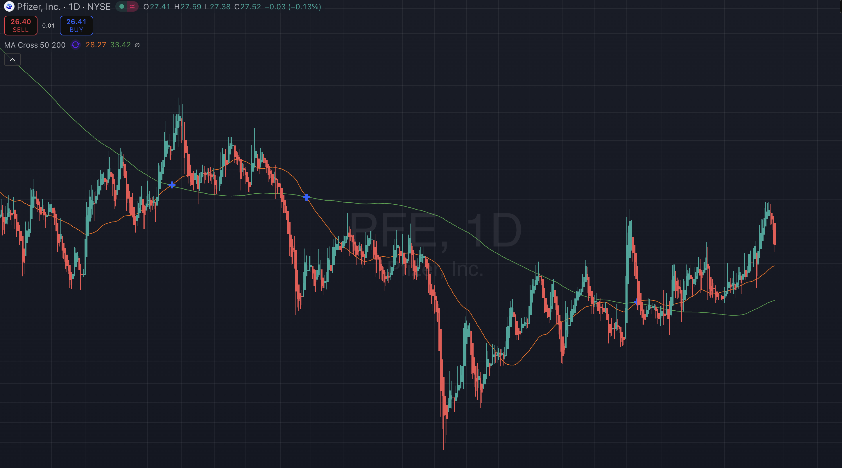 With PFE trading around 26.56 and holding above both its 50- and 200-day moving averages, the technical structure looks more constructive in the short term; however, with the 26 strike sitting just below current price and roughly three weeks until the March 13 expiry, the probability of the stock drifting back toward 26 remains meaningful — likely in the 35–40% range — meaning the chance of testing or even finishing near that level is still relatively high.