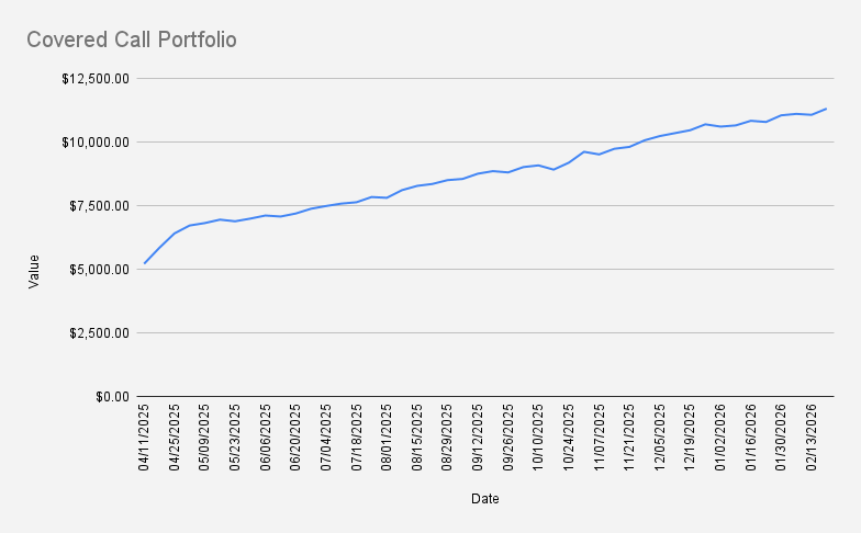 As of February 20, 2026, our covered-call stock portfolio has increased by +2.20% and closed at $11,312.
