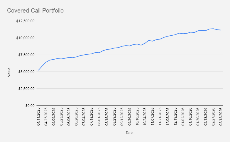 As of March 13, 2026, our covered-call stock portfolio has decreased slightly by -0.63% and closed at $11,141.