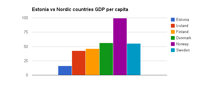Income level is not the same as GDP, but knowing GDP we can tell something about income level, isn't that right? I decided to make some quick GDP comparison levels of Nordic countries and Estonia.I don't know which countries Estonian economics professor counted as Nordic countries, but for the ease of continuing mathematical theories (my lame Google Spreadsheet graphs), I'll assume = Iceland, Sweden, Norway, Denmark and Finland are counted as Nordic countries,
