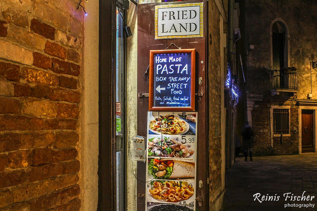 After we finally arrived to Venice, settled up in our hotel room, it was still a few hours until New Year, we decided to locate some charming Venice restaurant, but they all either were fully booked or just looked suspicious, suddenly we noticed a small fast food shop, and I decided to take a look, so that's how we found Fried Land in Venice.
