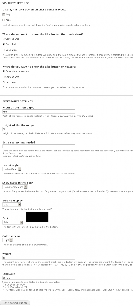 - Go to the Facebook Like button configuration page at admin/config/fblikebutton